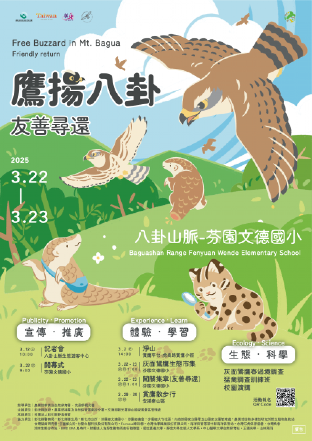 一、每年春分前後,八卦山的天空迎來數萬隻灰面鵟鷹,形成壯觀的「天空黑點秀」,吸引無數生態迷與攝影愛好者。今年「2025鷹揚八卦賞鷹活動」將於3月22、23日在芬園文德國小與八卦山賞鷹平台展開,活動主題為「友善尋還」,強調野生動物應各歸其位,並透過寓教於樂的方式,讓民眾在賞鷹之餘,深入了解生態保育的重要性。