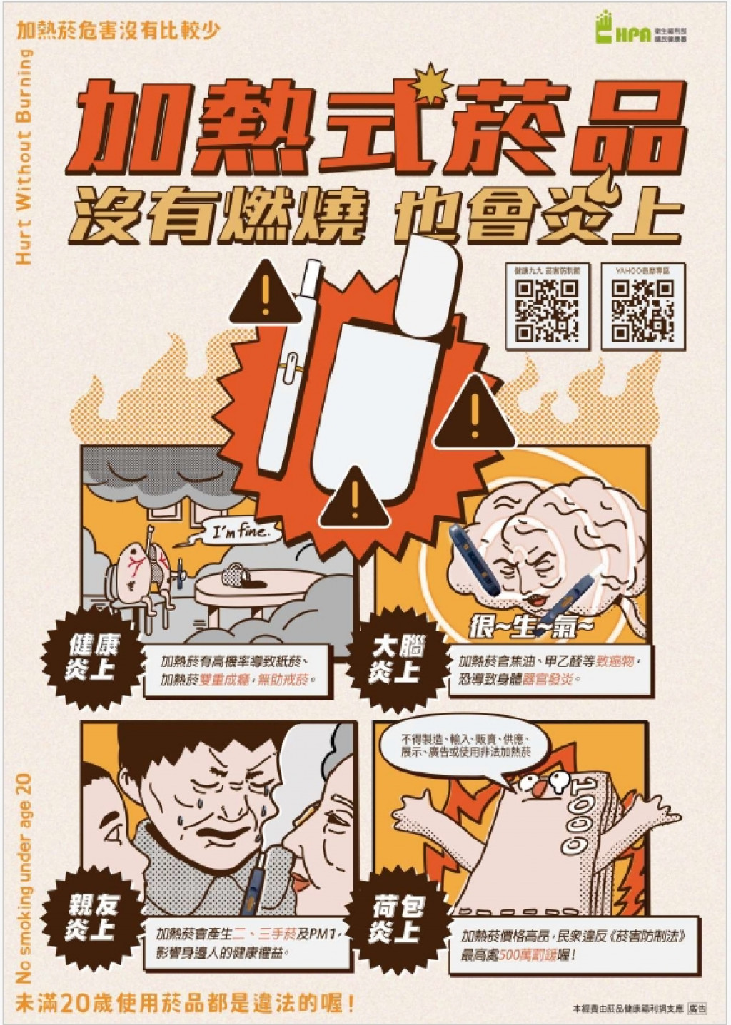 國民健康署官方網站之菸害防制主題置有「電子煙防制專區」(網址:https://www.hpa.gov.tw/Pages/List.aspx?nodeid=444),另於Yahoo奇摩搜尋引擎建置「大口呼吸無菸空氣 別碰電子煙及加熱菸」主題專區(網址:https://tw.news.yahoo.com/topic/2020health),持續製作相關資料,提供多元菸害(包括加熱菸)及電子煙危害相關素材,作為學校輔助教材或供學生查詢運用。 |